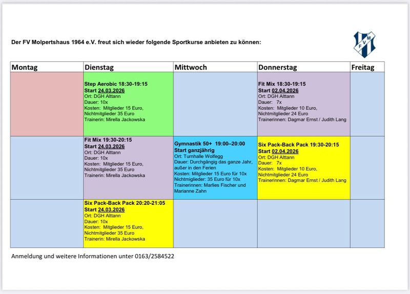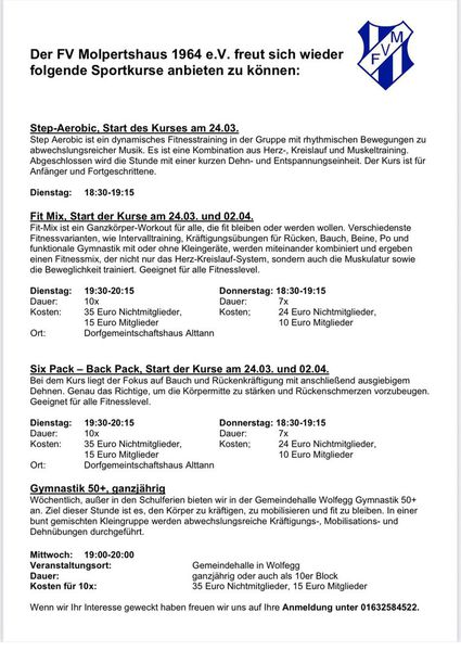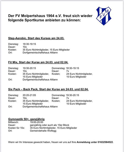 Der FV Molpertshaus 1964 e.V. freut sich wieder folgende Sportkurse anbieten zu können: